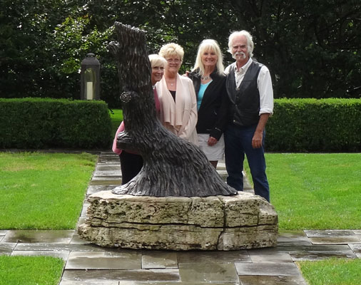 Bronze Sculpture: 5ft Trail Marker Tree sculpture by sculptor Dennis Downes. Installed on the Redwing Estate. Photo taken during party for the artist hosted by Nancy Hughes. John Hughes, motion picture Director, Producer, and Writer and his wife Nancy had a strong love of nature and specifically trees which resulted in this incredible 2,700 acre estate.