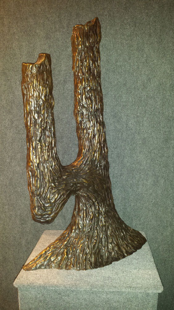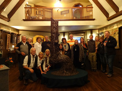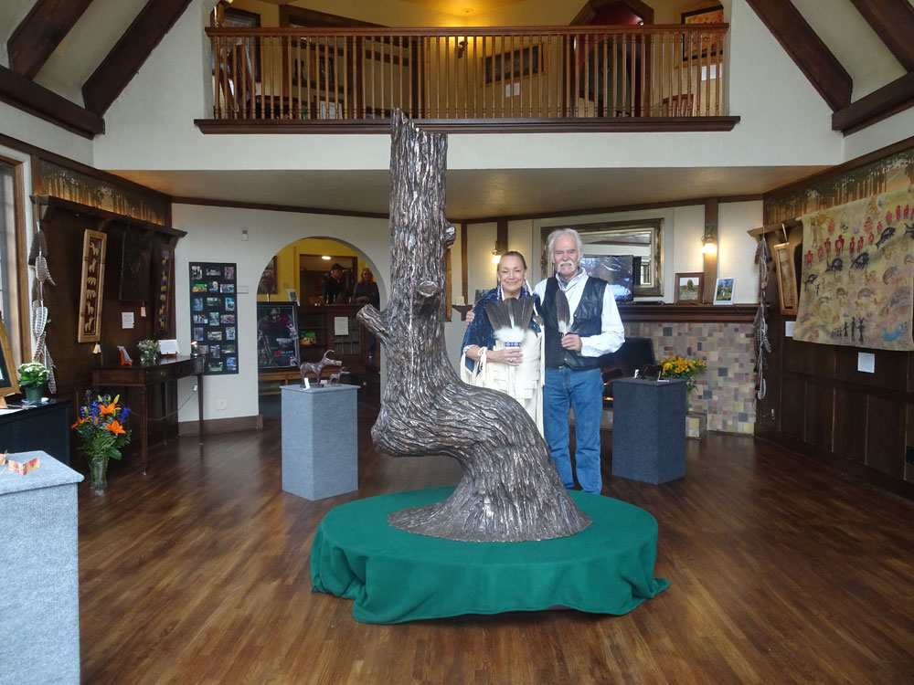 behind the 24" bronze "Trail Marker Tree" during an exhibit in Downtown