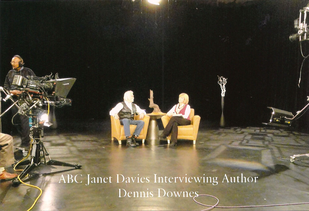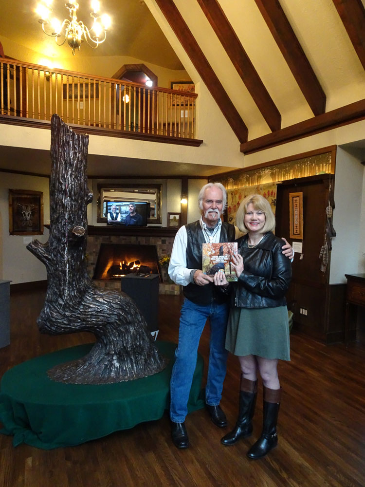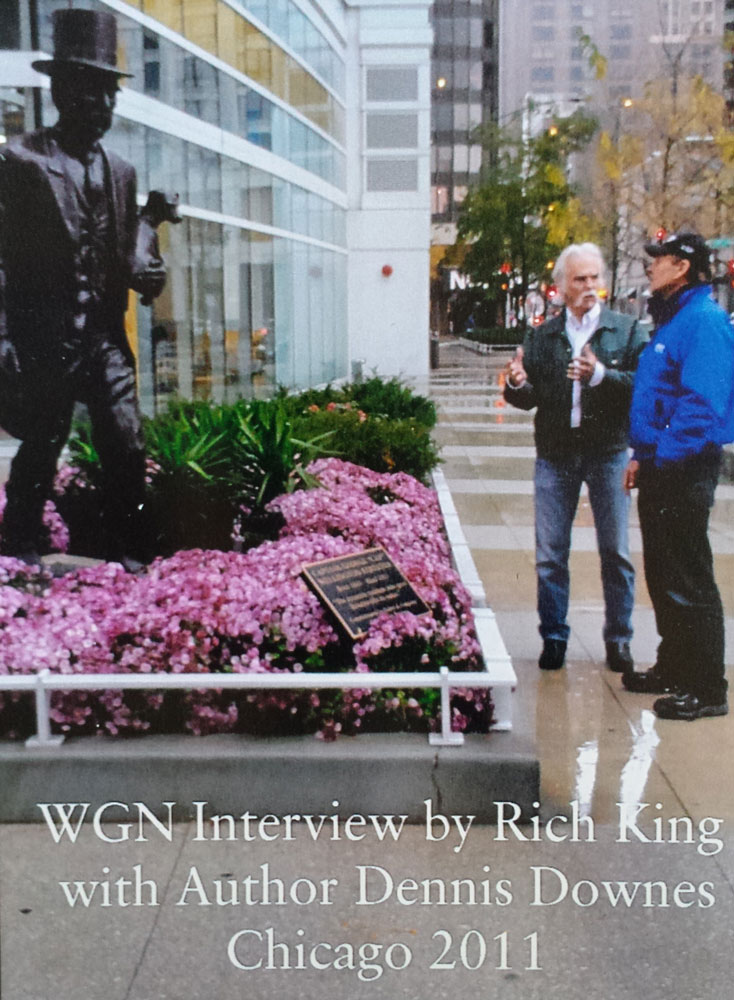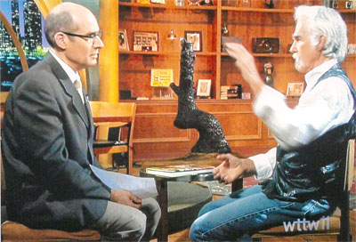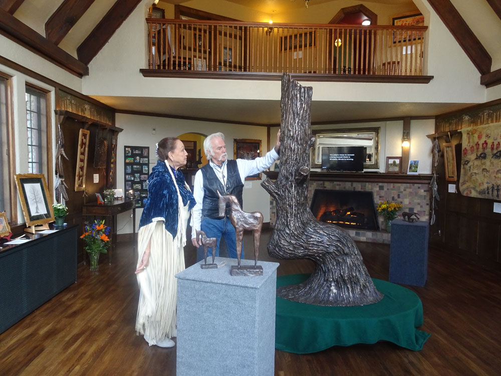 Janet Davies of ABC Chicago studios interviewing the artist author Dennis Downes for podcast. The artist shown here with his 24" bronze sculpture discussing the concept of the Trail Marker Trees and his book Native American Trail Marker Trees: Marking Paths to The Wilderness.