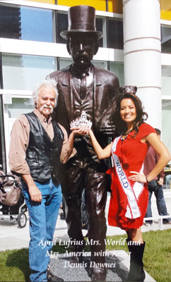 Artist Dennis Downes with Mrs. America/Mrs. World April Lufrius. Dennis was introduced to April by WGN's Rich King upon returning from the filming of "23 Blast" by Director Dylan Baker and Producer Gary Donatelli. Dennis and his artwork appear briefly in this movie based on Travis Freeman's real life. Travis contracts an infection that destroys his optic nerve and renders him blind overnight. April Lufrius is a volunteer to help raise funds and bring awareness to Retinitis Pigmentosa, a disease that causes blindness which has affected her own life.